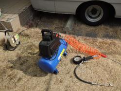 2ヶ月ぶりにコンプレッサーを起動し、地面に寝転がって空気圧調整です。
