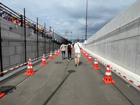シャトルバスや大屋根リング(の裏側)や工事エリアの境の看板などを見ながら歩けたので、歩くのがあまり苦にならない私にとっては、このルート選択は正解でした
